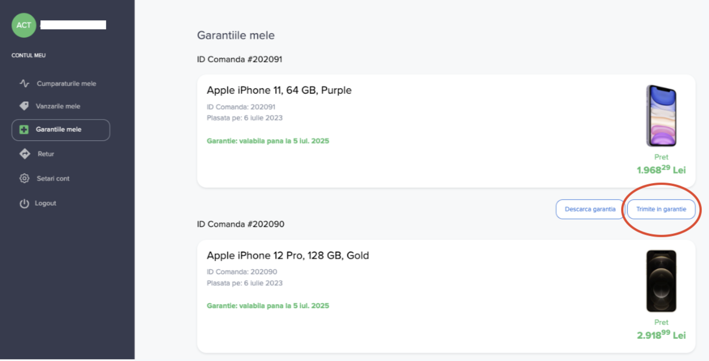 3. Mergi in sectiunea Garantiile Mele si selectezi Trimite in Garantie dedesubtul produsului pe care vrei sa il trimiti la Flip.